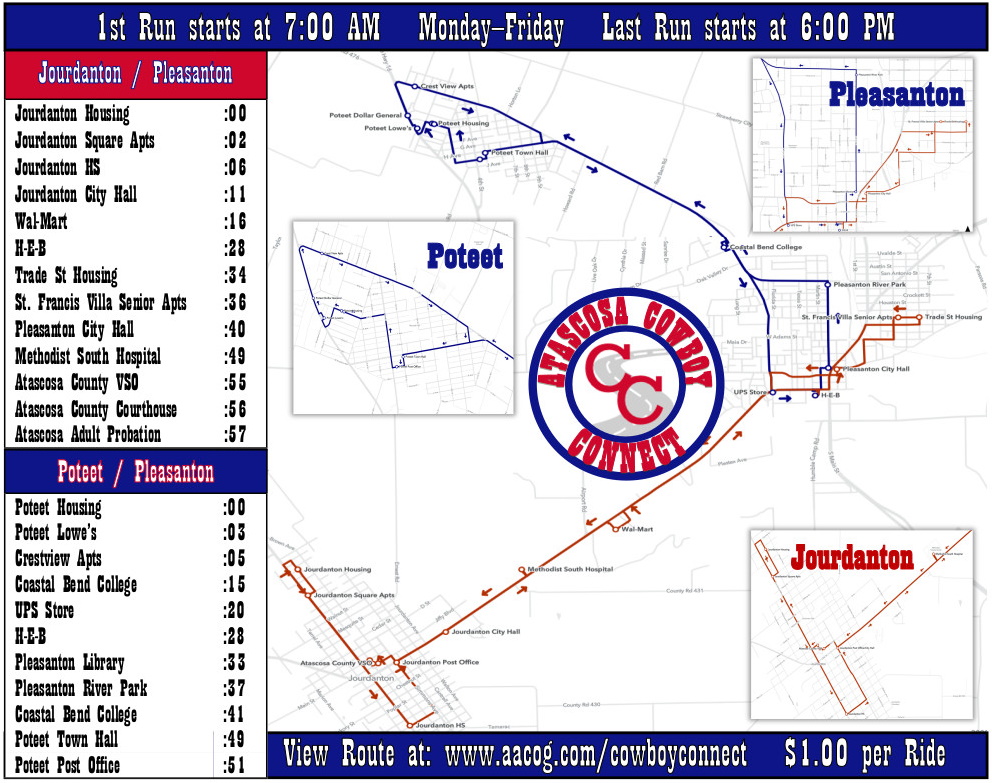 In partnership with Atascosa County and the cities of Jourdanton, Poteet, and Pleasanton, Alamo Regional Transit started a new transit system in Atascosa County on July 1, 2020. This route has since evolved and changes were made from comments of residents in the communities. Atascosa Cowboy Connect will bring together the 3 communities, servicing all residents at the affordable rates and reliable transportation ART is known for. Atascosa Cowboy Connect is a time point transit system that will follow a set route connecting the cities, but can also deviate up to a .5 mile to include those that may not be able to get to the route, for an additional cost. These 2 loops, one hour long each, will connect residents of Jourdanton and Poteet to Pleasanton from residences to places of employment, County offices, retail centers, and much more.